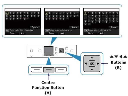 ] buttons (B) to select a character from the keyboard, then press the [OK] button to select and move to the next character.