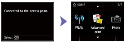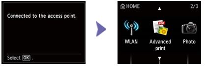 3. When the message [Connected to the access point] is displayed on the screen as shown below, press the [OK] button to complete the setup.