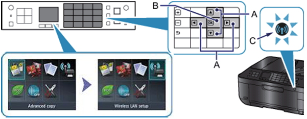 ] buttons (A) to navigate to the [Wireless LAN Setup] or [WLAN Setup] icon and press the [OK] button (B).
